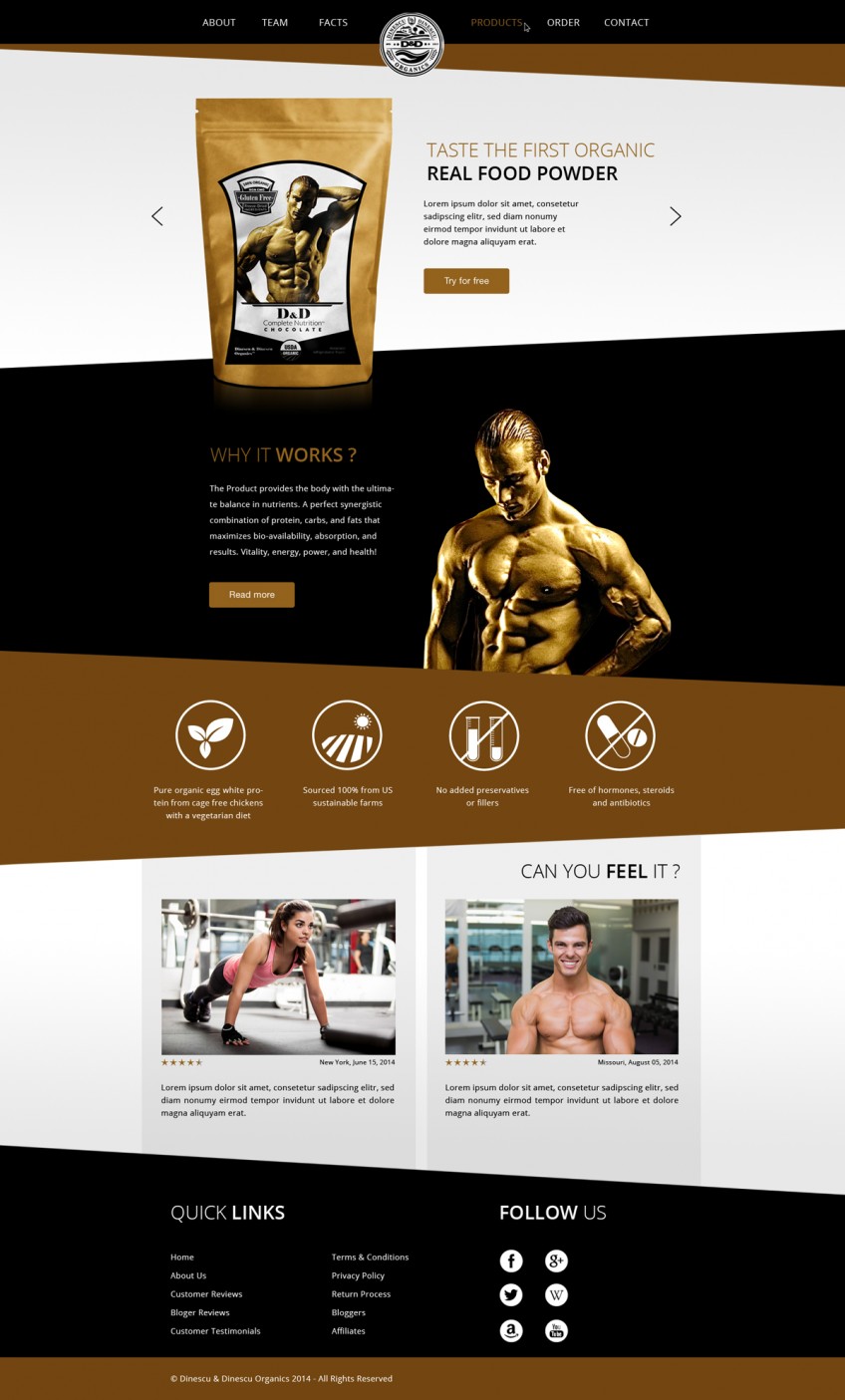 A clear, minimalistic and storytelling web design for D&D‘s new product launch. Creating space for the first USDA organic real food powder and supporting the organic Movement of the Dinescu brothers in the health & fitness industry.