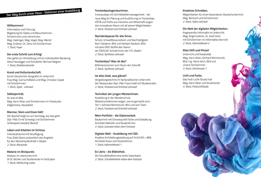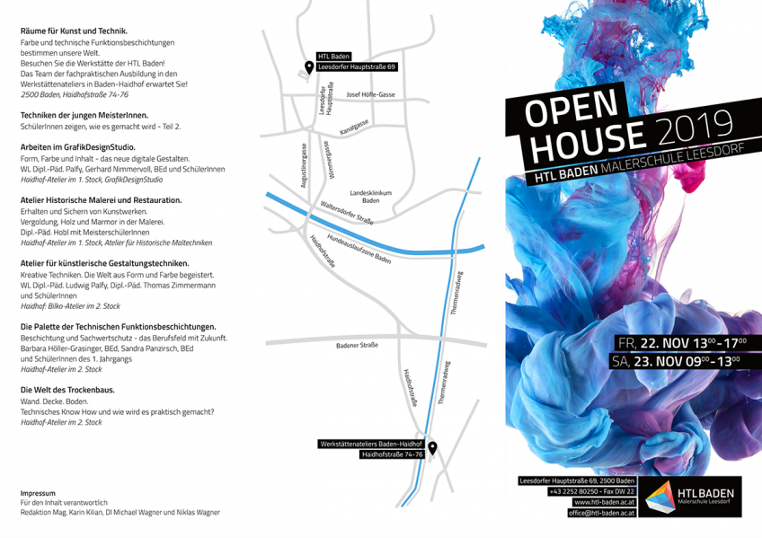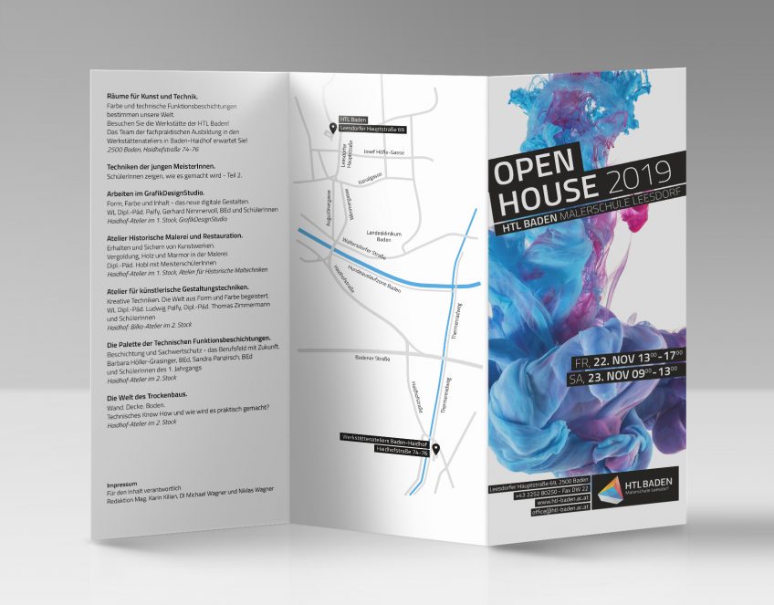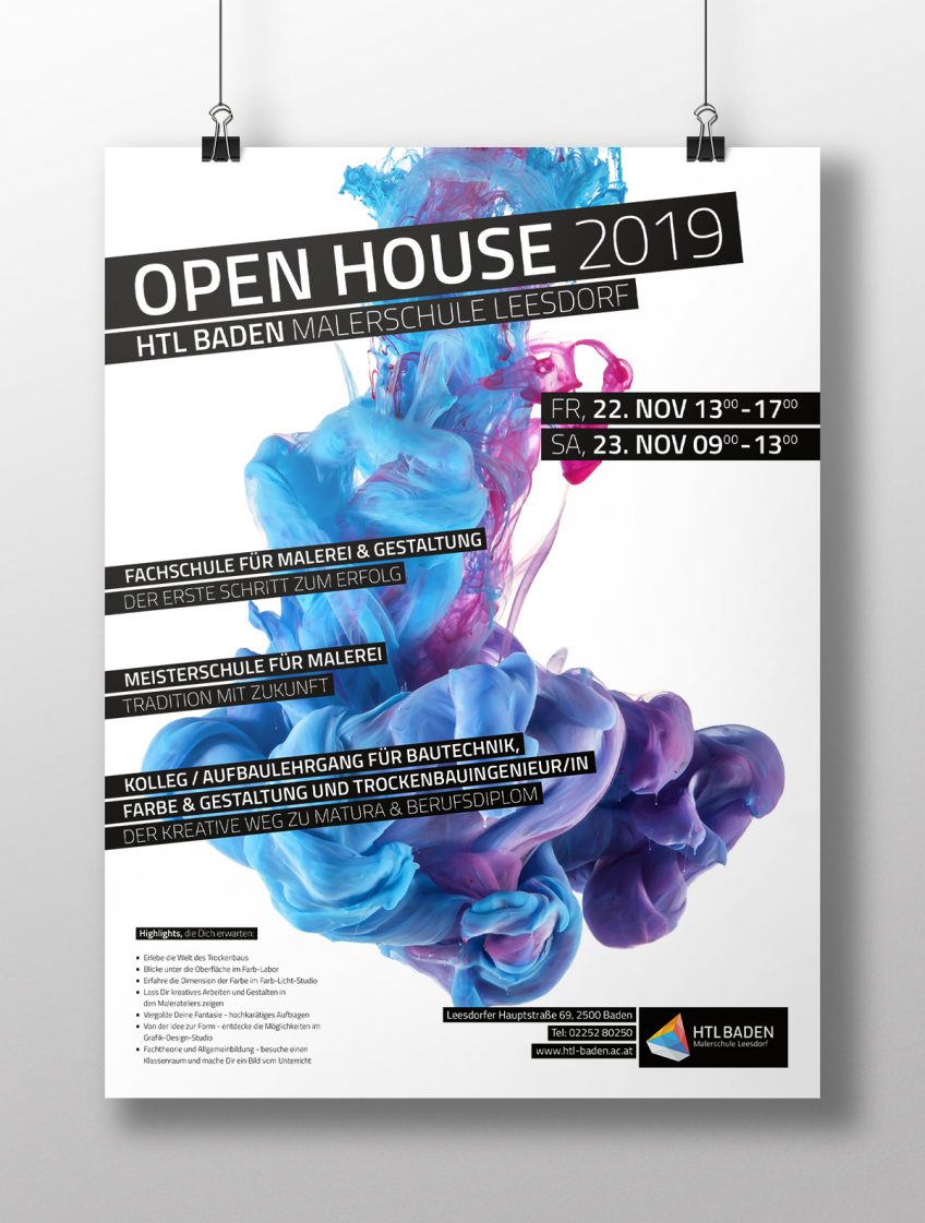 A cross-media advertising campaign for the promotion of „Open House“ at the HTL Baden (flyer, poster, outdoor advertising, program folder, newspaper ad, Facebook event cover and landing page).